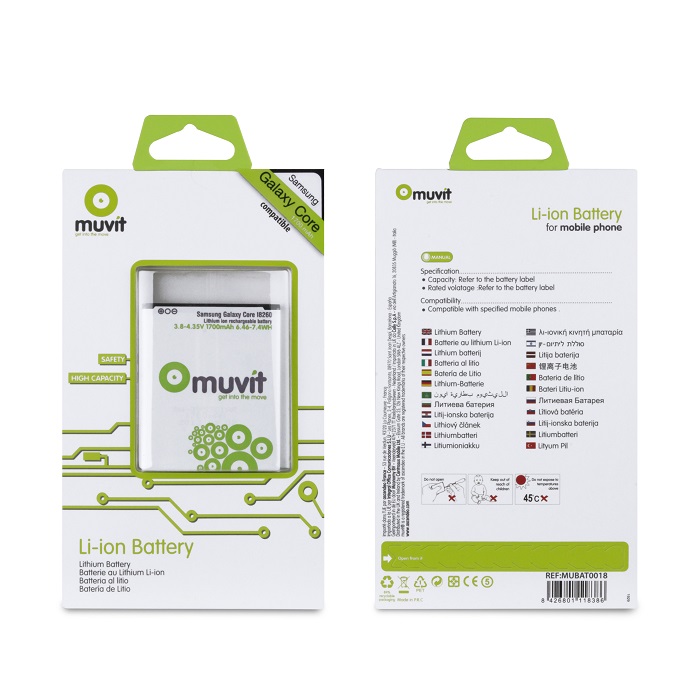 Si la autonomía de tu Samsung Galaxy Core Mini se ha reducido drásticamente, Muvit pone a tu disposición esta batería recargable de 1700 mAh para recuperar tu smartphone con problemas de batería. También puedes adquirir esta batería para tener una auxiliar para esos días en los que no sabes la hora de regreso a casa y necesitas estar operativo el mayor tiempo posible.
